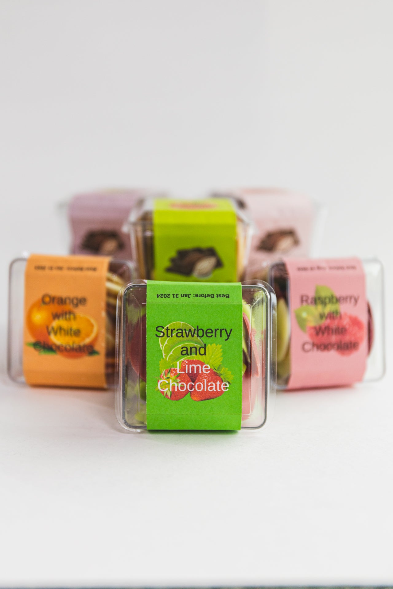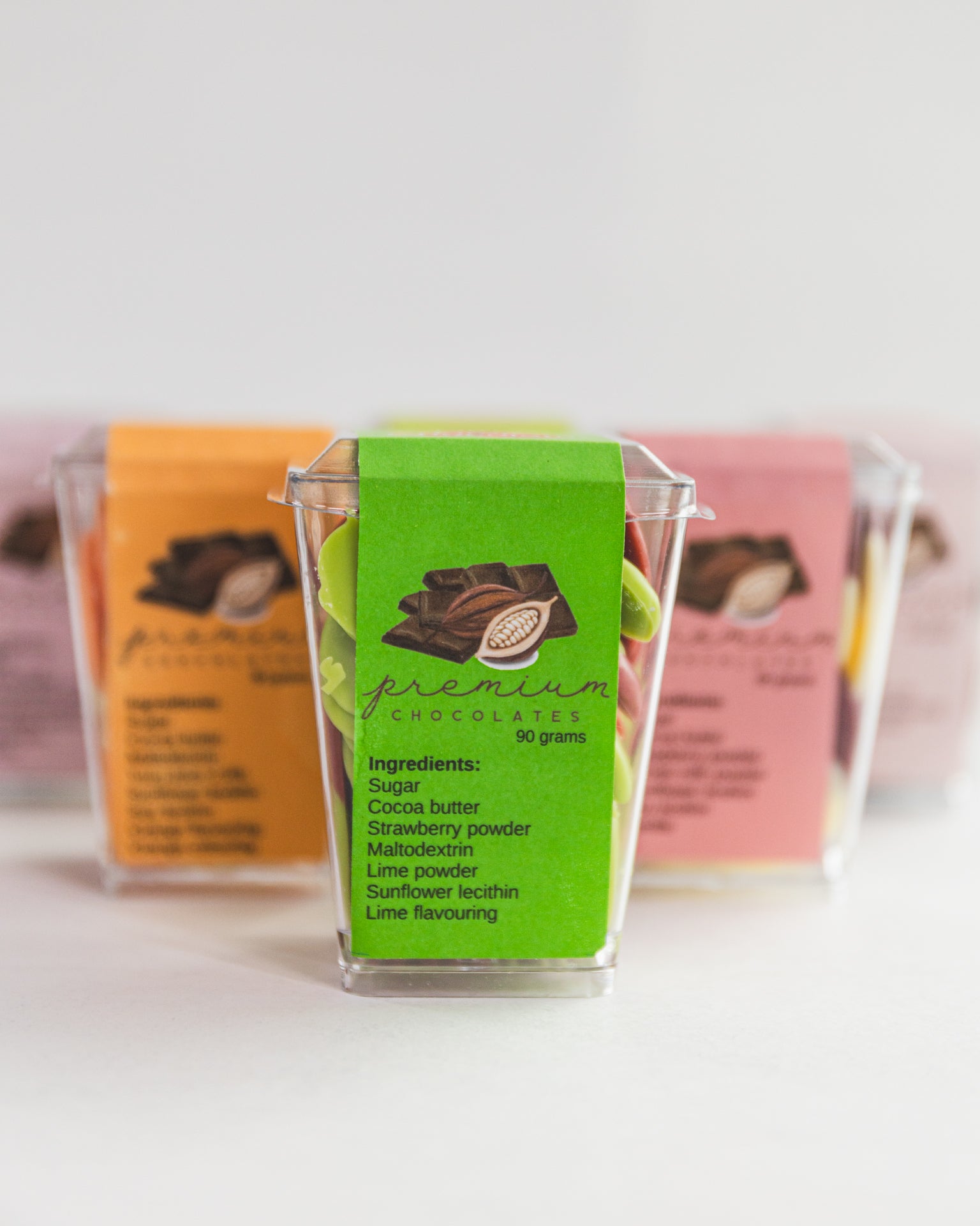 Each cup holds 90 grams of chocolate in approximately thirty 3 grams chocolate pieces, and they come in the following flavours: